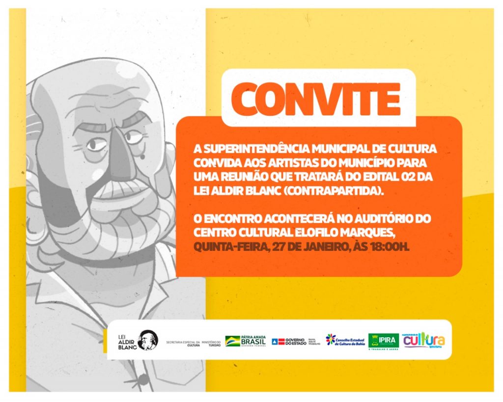 A Superintendência Municipal de Cultura convida aos artistas do município para uma reunião que tratará do Edital 02 da Lei Aldir Blanc (contrapartida). O encontro acontecerá na Sede da Coordenadoria de Educação, na próxima quinta-feira, 27 de janeiro, às 18:00h. Divulgação Ascom Prefeitura Municipal de Ipirá