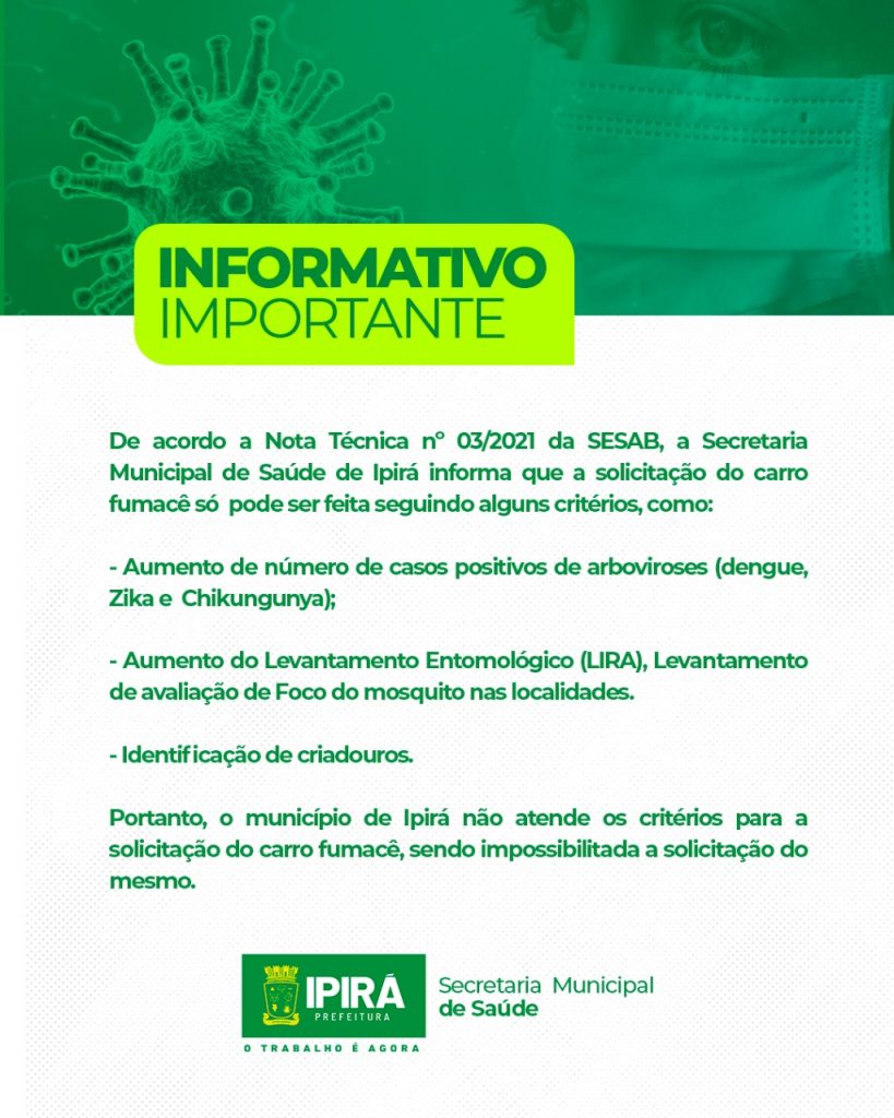 De acordo a Nota Técnica nº 03/2021 da SESAB, a Secretaria Municipal de Saúde de Ipirá informa que a solicitação do carro fumacê só pode ser feita seguindo alguns critérios, como: Aumento de número de casos positivos de arboviroses (dengue, Zika e Chikungunya); Aumento do Levantamento Entomológico (LIRA), Levantamento de avaliação de Foco do mosquito […]