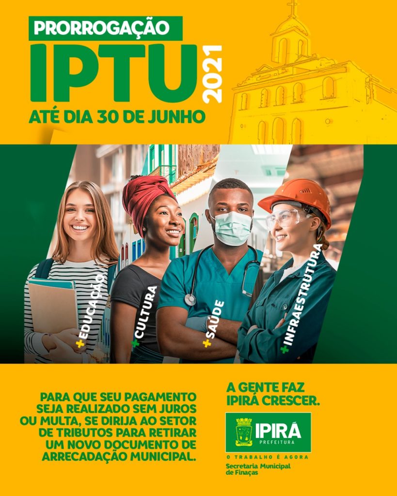 Entendendo a dificuldade dos contribuintes, ocasionada pela pandemia, a Prefeitura de Ipirá informa que prorrogou o prazo para pagamento do IPTU – Imposto Predial e Territorial Urbano. Os contribuintes terão até o dia 30 de junho para regularizar a situação sem juros e multa. Para efetuar o pagamento sem encargos, o cidadão deverá emitir um […]