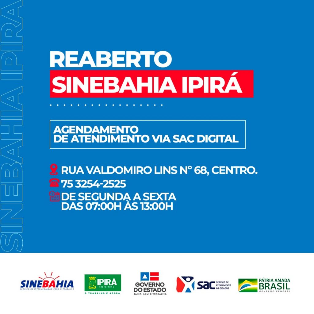 Prefeitura de Ipirá trabalha junto com SINEBAHIA para garantir emprego e renda para os moradores do município. E através do Governo da Bahia, o SINE IPIRÁ foi reaberto em nosso município e já se encontra em funcionamento, oferecendo serviços como: intermediação de mão de obra, seguro desemprego e o agendamento para atendimento é realizado de […]