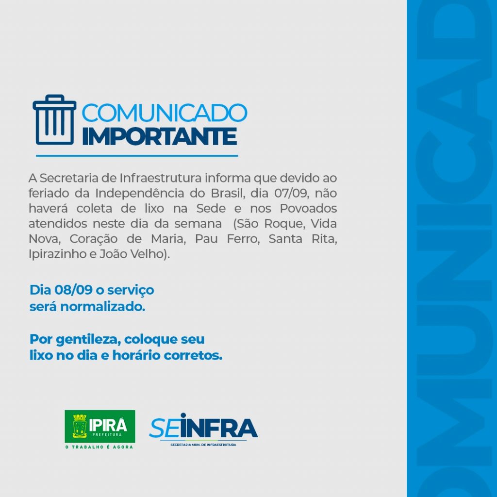 A Secretaria de Infraestrutura informa que devido ao feriado da Independência do Brasil, dia 07/09, não haverá coleta de lixo na Sede e nos Povoados atendidos neste dia da semana (São Roque, Vida Nova, Coração de Maria, Pau Ferro, Santa Rita, Ipirazinho e João Velho). Dia 08/09 o serviço será normalizado. Por gentileza, coloque seu […]