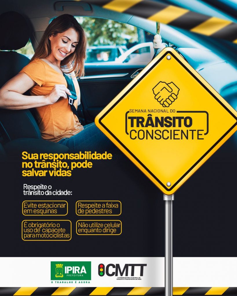 Sua responsabilidade no trânsito, pode salvar vidas! Na Semana Nacional do Trânsito, A Prefeitura de Ipirá junto a Coordenadoria Municipal de Trânsito reafirmam a importância de cada cidadão para manter um trânsito mais seguro para todos!