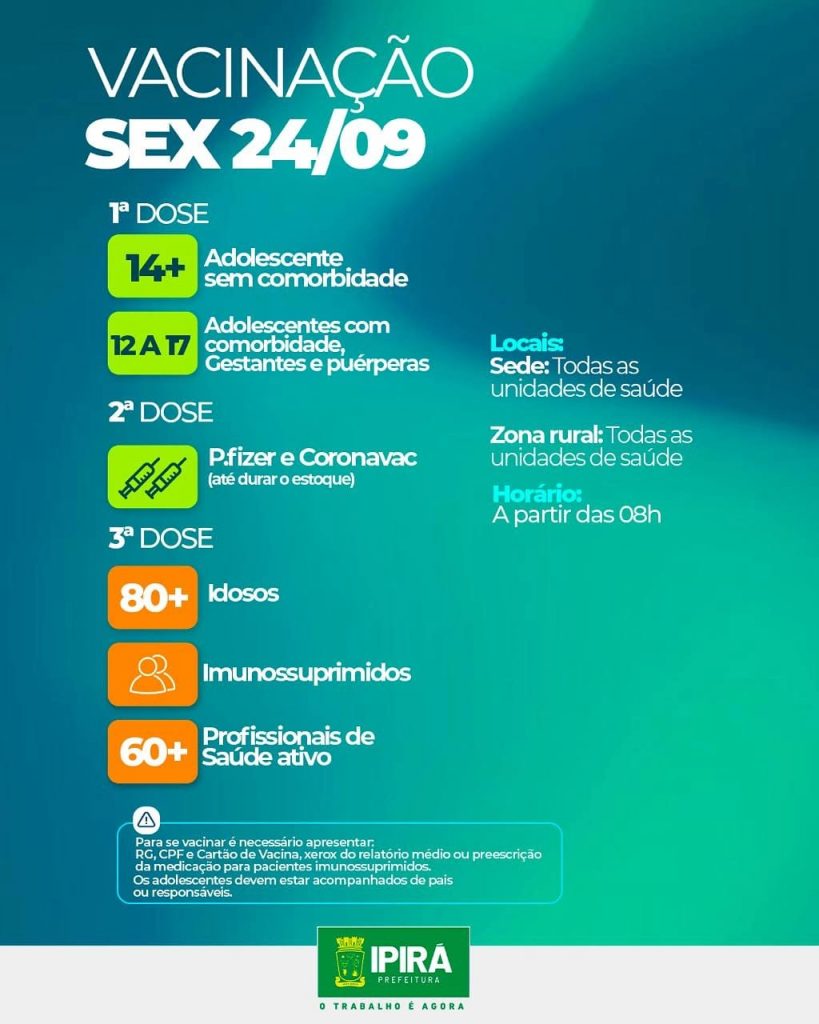O Cronograma de vacinação segue nessa sexta-feira (24), para adolescentes com 14 anos ou mais sem comorbidades, adolescentes com comorbidades, gestantes e puérperas com 12 a 17 anos. A segunda dose está disponível para Coronavac e Pfizer, a Secretaria de Saúde não recebeu lote de segunda dose para Astrazeneca. A terceira dose continua para idosos […]