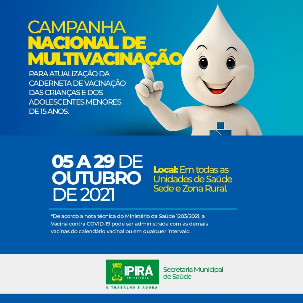 A Secretaria Municipal de Saúde de Ipirá iniciou nesta terça-feira (05), a campanha de Multivacinação, para atualização da caderneta de vacinação das crianças e adolescentes menores de 15 anos de idade. A campanha vai até o dia 29 de outubro e estará disponível em todas as Unidades de Saúde da Sede e Zona Rural. Divulgação […]