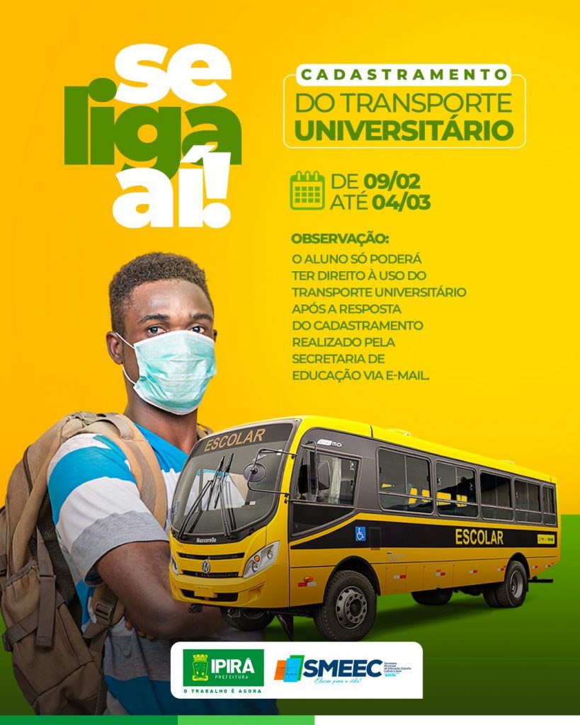 A Prefeitura de Ipirá, através da Secretaria Municipal de Educação iniciou o processo de cadastramento de estudantes para uso do transporte universitário para instituições de ensino na cidade de Feira de Santana. O estudante precisará preencher o formulário disponível aqui https://forms.gle/UzQPtGK2defyAgh38 disponibilizando dados para estar em contato com a Secretara de Educação. O prazo para […]