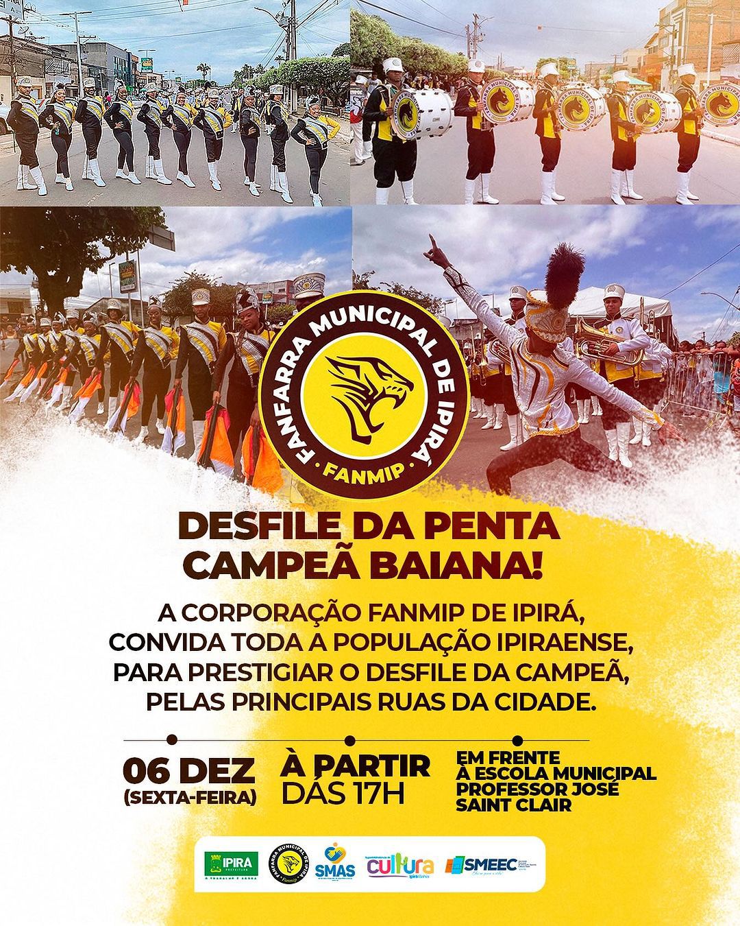 A Corporação Fanmip de Ipirá, cinco vezes campeã baiana, convida a população ipiraense para prestigiar o desfile comemorativo que tomará as principais ruas da cidade. O evento, que celebra mais uma conquista da Fanmip, promete encantar a comunidade com sua performance premiada. Data: 06 de dezembro de 2024 (sexta-feira)Horário: A partir das 17hSaída: Em frente […]