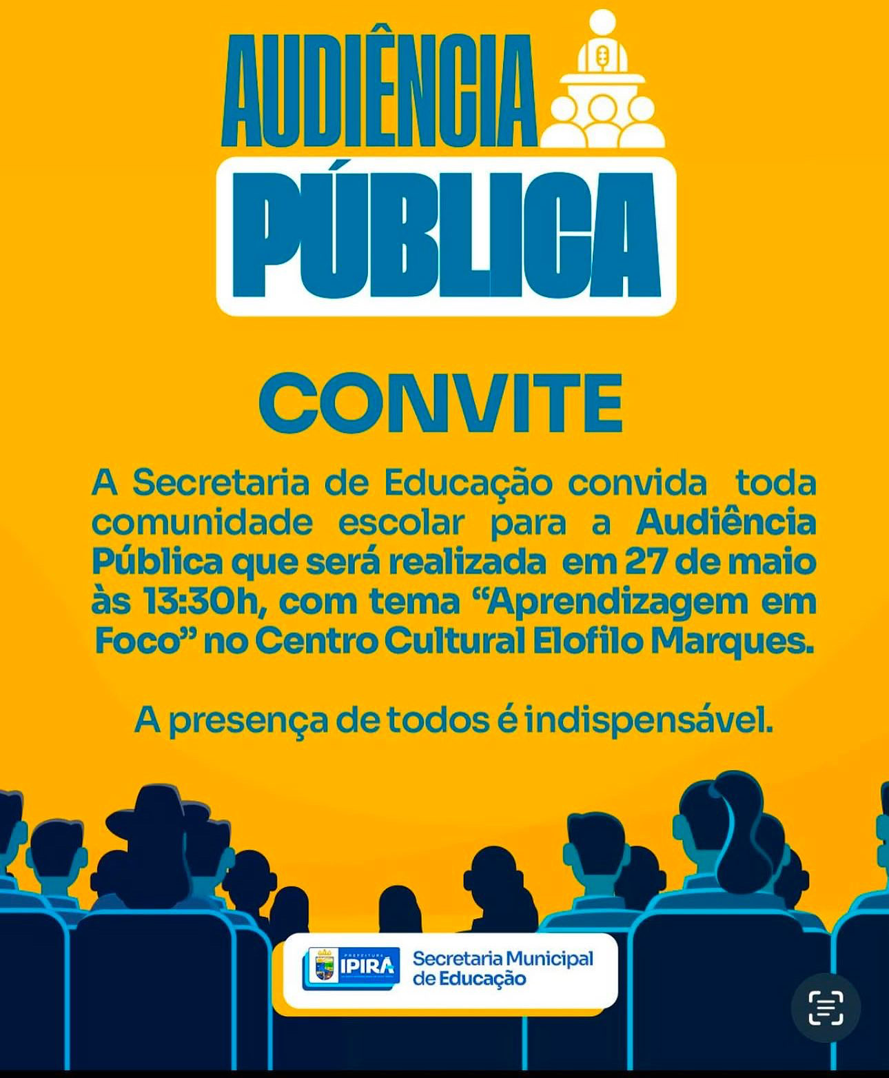 A Secretaria Municipal de Educação de Ipirá realiza na próxima segunda-feira, dia 27 de maio, uma Audiência Pública com o tema “Aprendizagem em Foco”. O encontro acontecerá no Centro Cultural Elofilo Marques, a partir das 13h30, e é aberto a toda a comunidade escolar. O objetivo do evento é promover um espaço de diálogo e […]