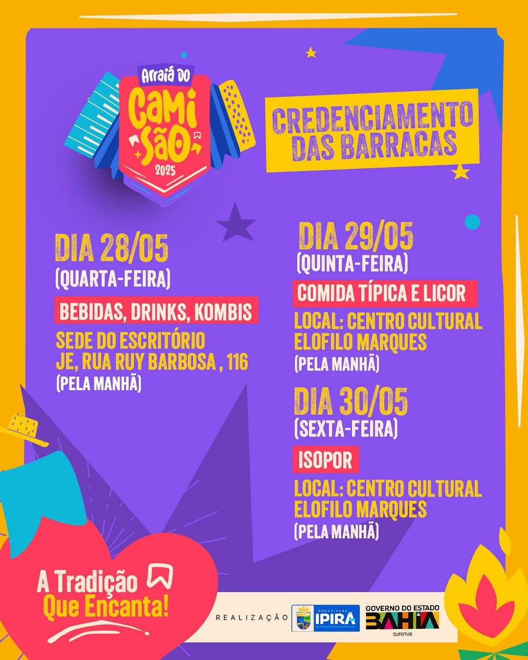 Prefeitura de Ipirá divulga calendário de credenciamento das barracas para o Arraiá do Camisão 2025